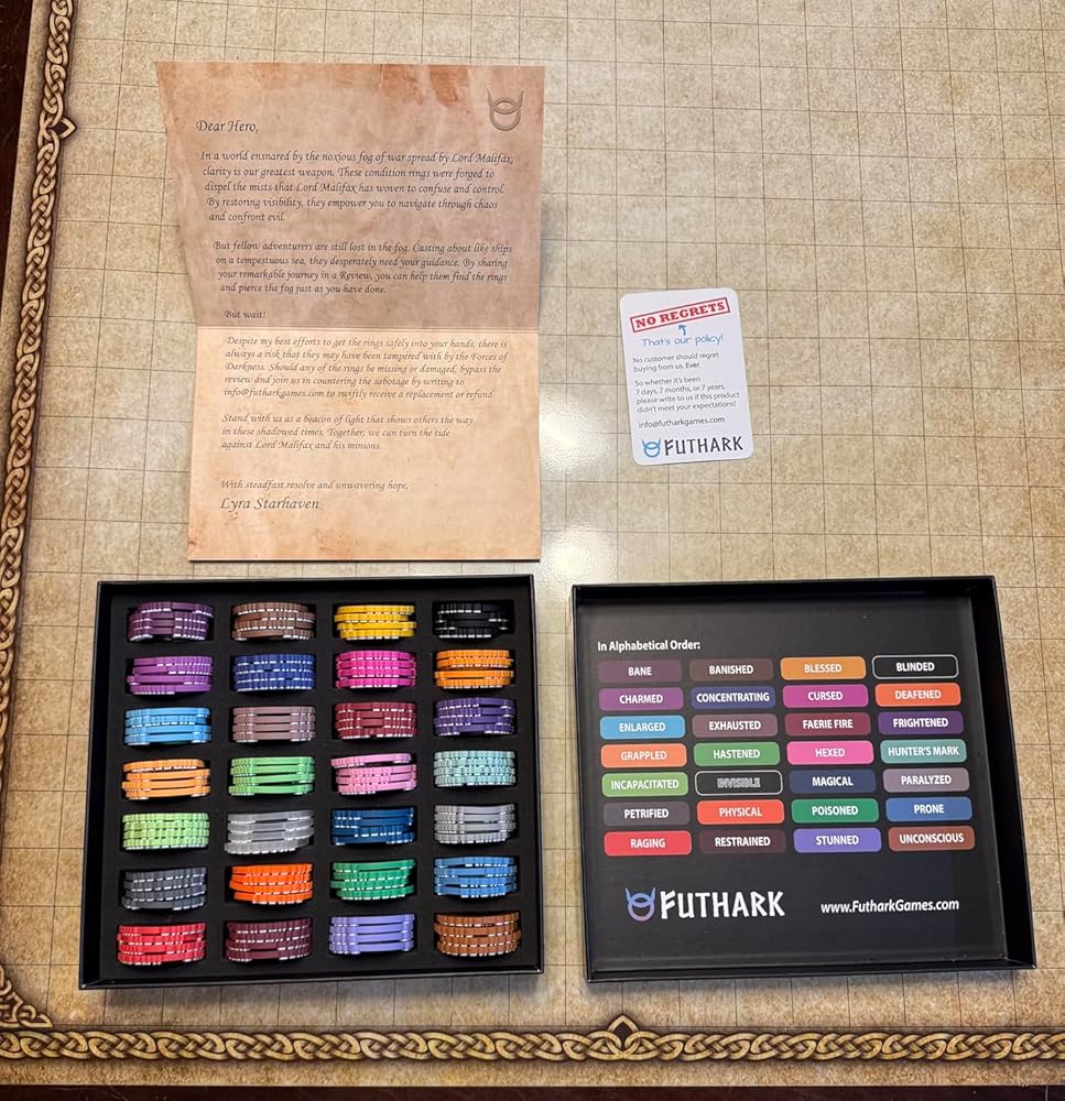 - CLARITY IN CHAOS: Eliminate confusion in the heat of battle with 112 vibrant DND status rings - 4 each of 28 conditions with 2 wildcards for unexpected twists! Excellent 3D visibility from any angle.